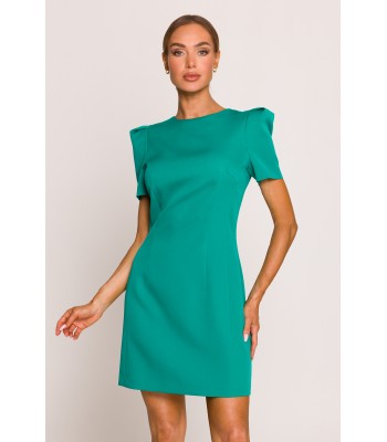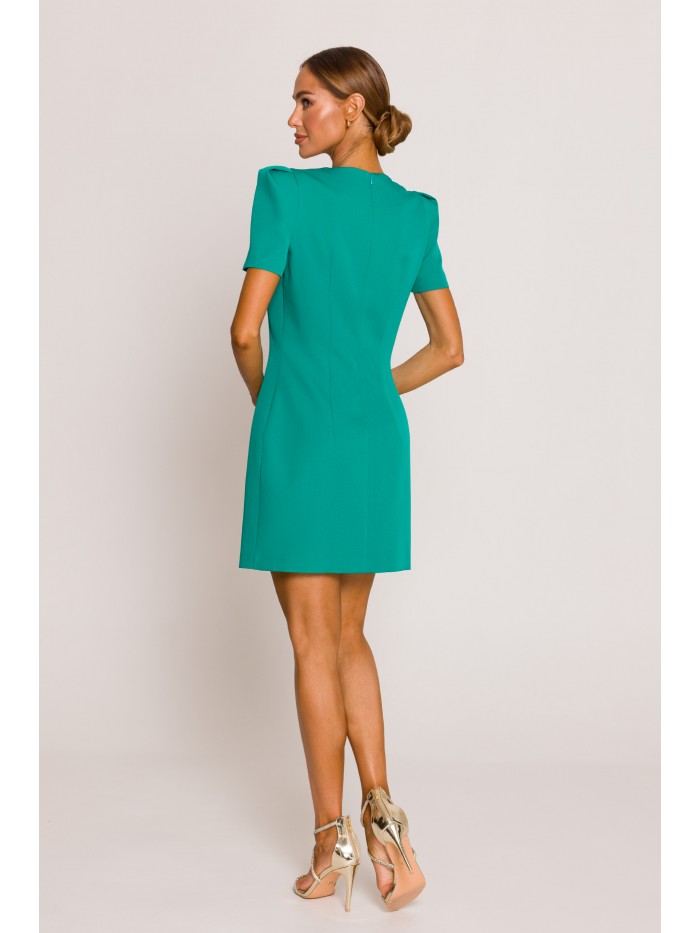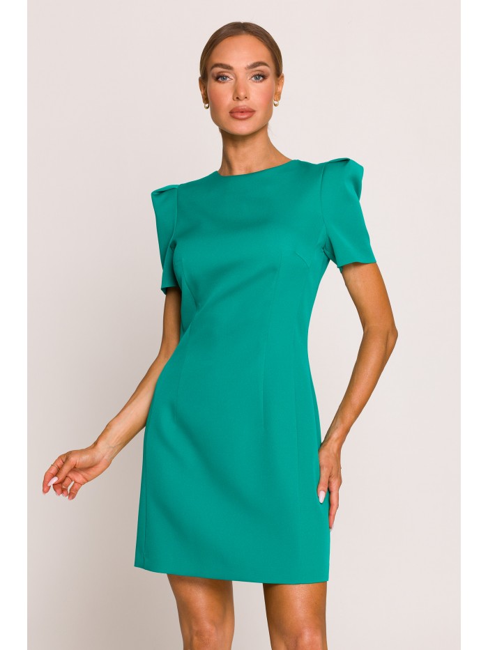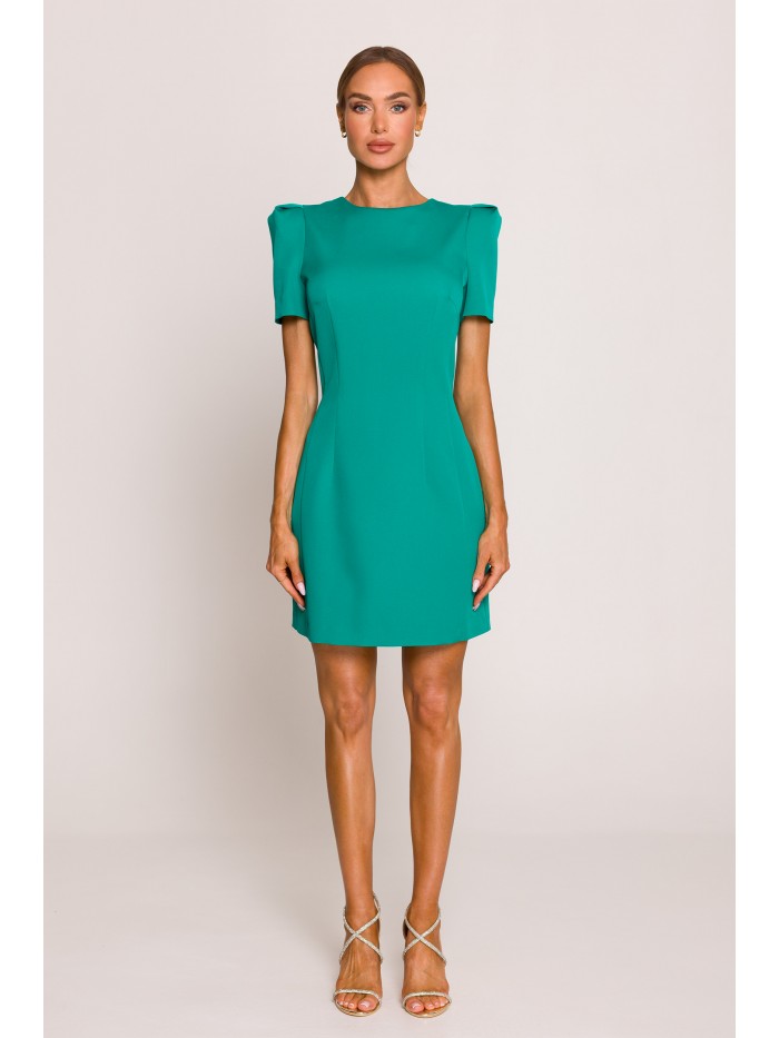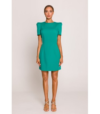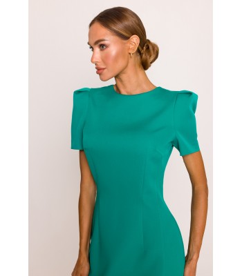 Very comfortable knitted midi dress with high rise waistline and a loose skirt, optically narrows the waist, and due to the straight cut, it additionally slims the entire figure. This beautiful dress has characteristic, very short sleeves and a built-up neckline. Perfect for both everyday and formal styling.