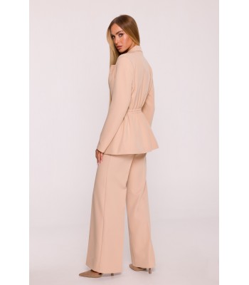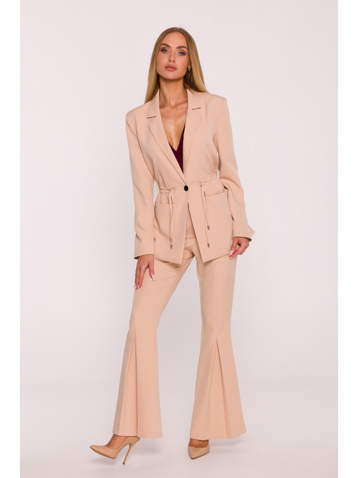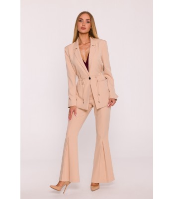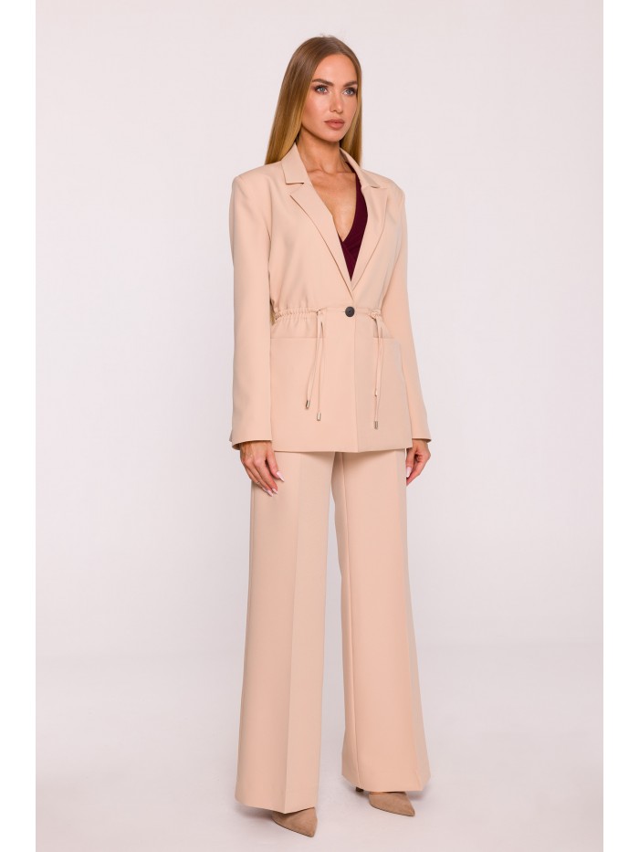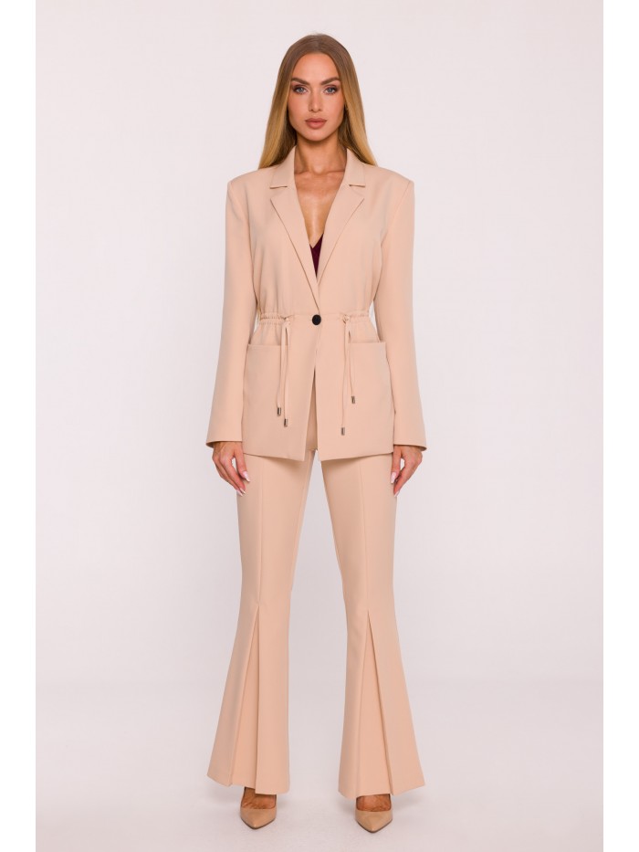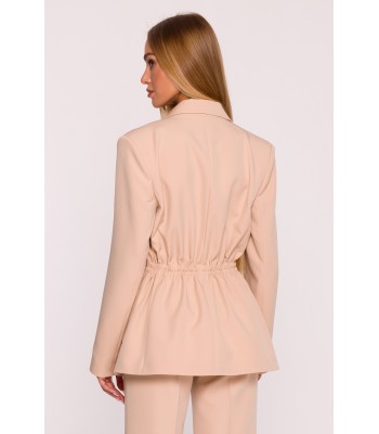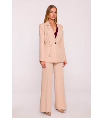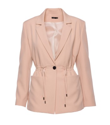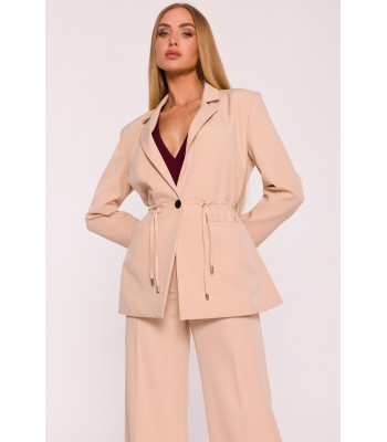 Office jacket with a peaked collar and a single-button closure. Flap pockets at the front. Long sleeves with buttons. Padded shoulders. Back vent. Fully lined.