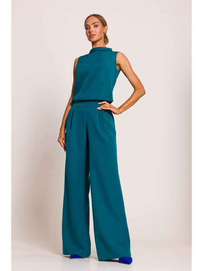 A kimono top jumpsuit with sleek, straight-leg trousers. Plain and simple but at the same time extremely elegant every day or evening look.