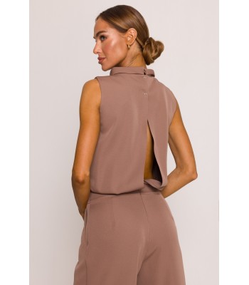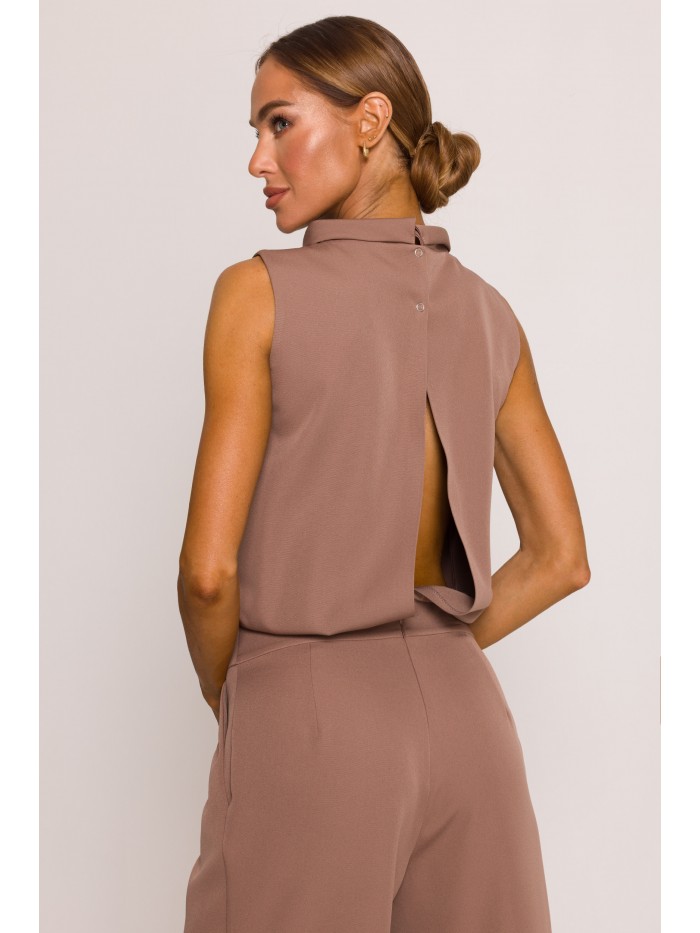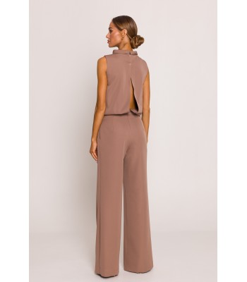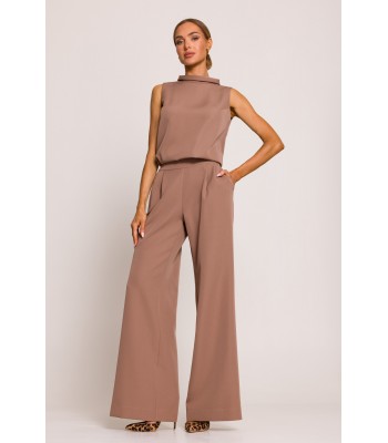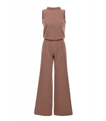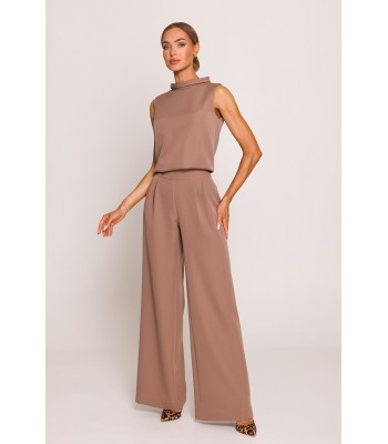 Be one of a kind choosing this original jumpsuit with wide leg design and decorative double layer front sleeveless top featuring high collar and lovely fastening on the shoulder.