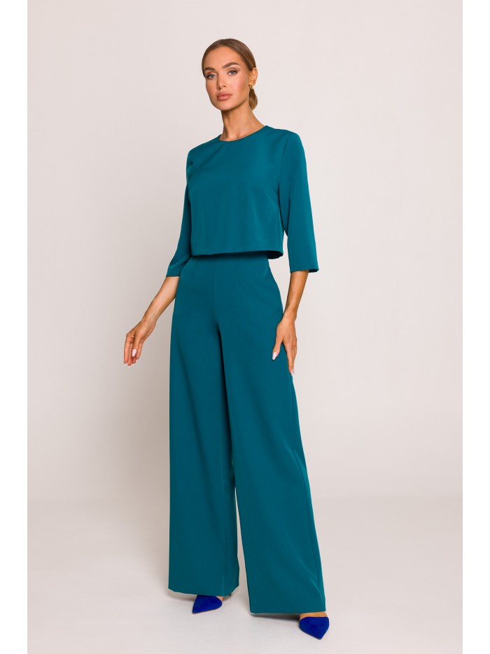 Kombinezon wszedł już na dobre do garderoby dedykowanej na specjalne okazje. Nasz fantastyczny kombinezon z eleganckimi szerokimi nogawkami idealnie nadaje się na wielkie wyjścia dzięki wyjątkowej górze z wywijaną stójką i ozdobnym zapięciem na ramieniu oraz podwójnym, dekoracyjnym przodem.