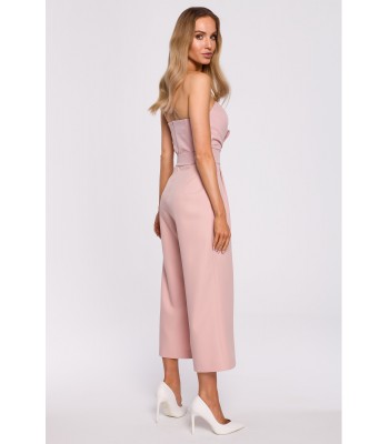 Przełam stereotypy i wyraź się poprzez swój strój! Ten kombinezon ma tę moc! Efektowna gorsetowa góra z mocnymi detalami takimi jak: drapowana kokarda i pasek wiązany wokół talii, a do tego szerokie nogawki długości 7/8 podkreślą Twój indywidualny styl.
