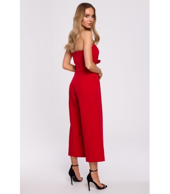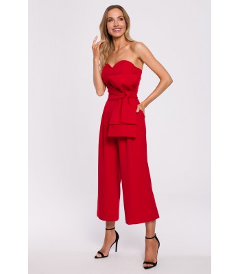 Przełam stereotypy i wyraź się poprzez swój strój! Ten kombinezon ma tę moc! Efektowna gorsetowa góra z mocnymi detalami takimi jak: drapowana kokarda i pasek wiązany wokół talii, a do tego szerokie nogawki długości 7/8 podkreślą Twój indywidualny styl.