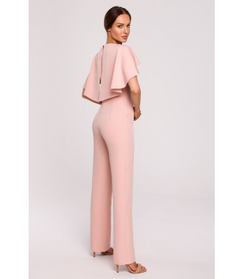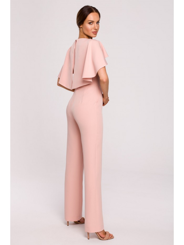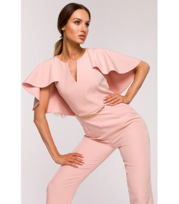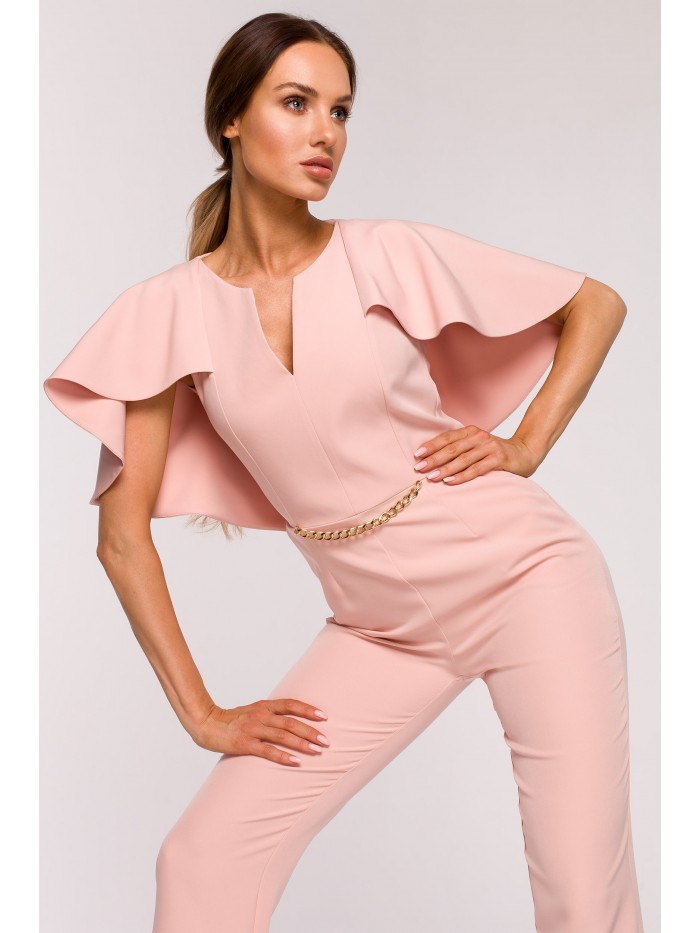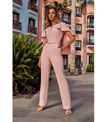 Moc tkwi w szczegółach. Kobieca kreacja na specjalne okazje to wygodne spodnium z wyjątkowo kobiecym wykończeniem - peleryną i łańcuszkiem zdobiącym gładki przód kombinezonu.