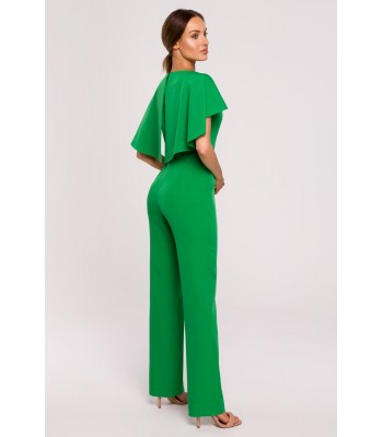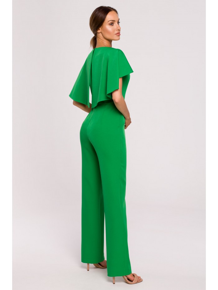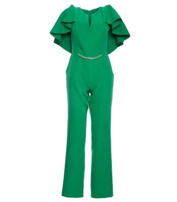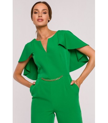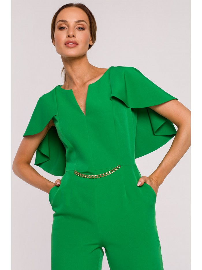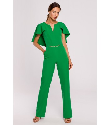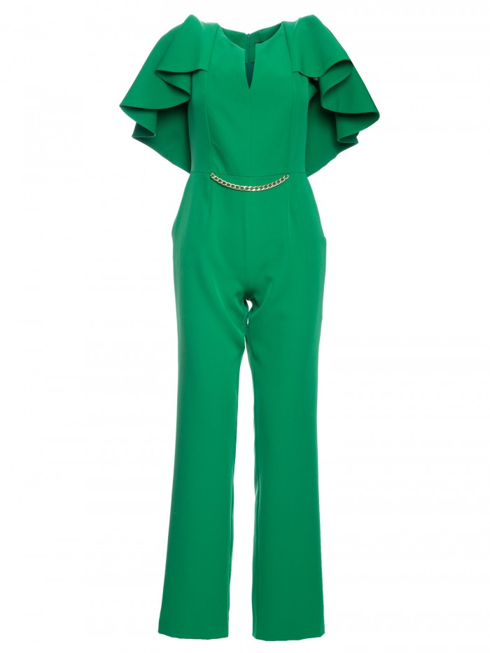 Moc tkwi w szczegółach. Kobieca kreacja na specjalne okazje to wygodne spodnium z wyjątkowo kobiecym wykończeniem - peleryną i łańcuszkiem zdobiącym gładki przód kombinezonu.