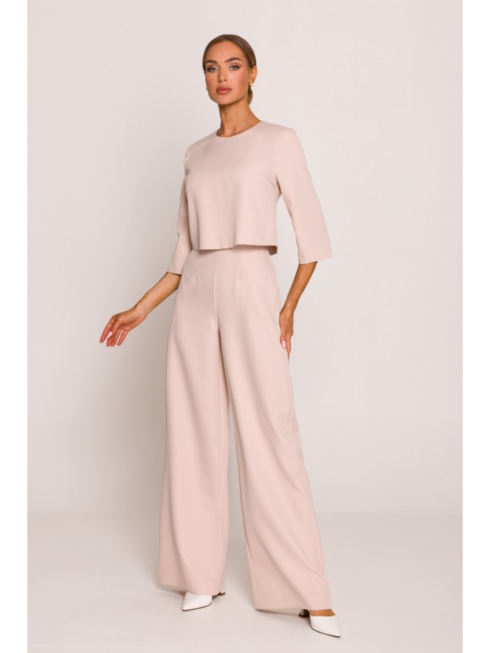 Kombinezon wszedł już na dobre do garderoby dedykowanej na specjalne okazje. Nasz fantastyczny kombinezon z eleganckimi szerokimi nogawkami idealnie nadaje się na wielkie wyjścia dzięki wyjątkowej górze z wywijaną stójką i ozdobnym zapięciem na ramieniu oraz podwójnym, dekoracyjnym przodem.
