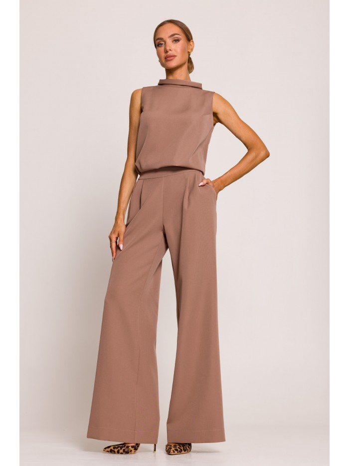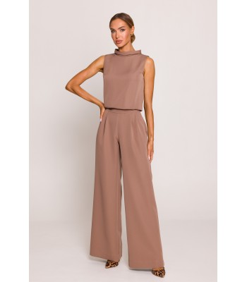 Wygodny i niekrępujący ruchów a zarazem elegancki kombinezon z luźniejszą górą, krótkimi rękawami i prostymi nogawkami z zaszewkami przy pasku. Na co dzień i od święta.