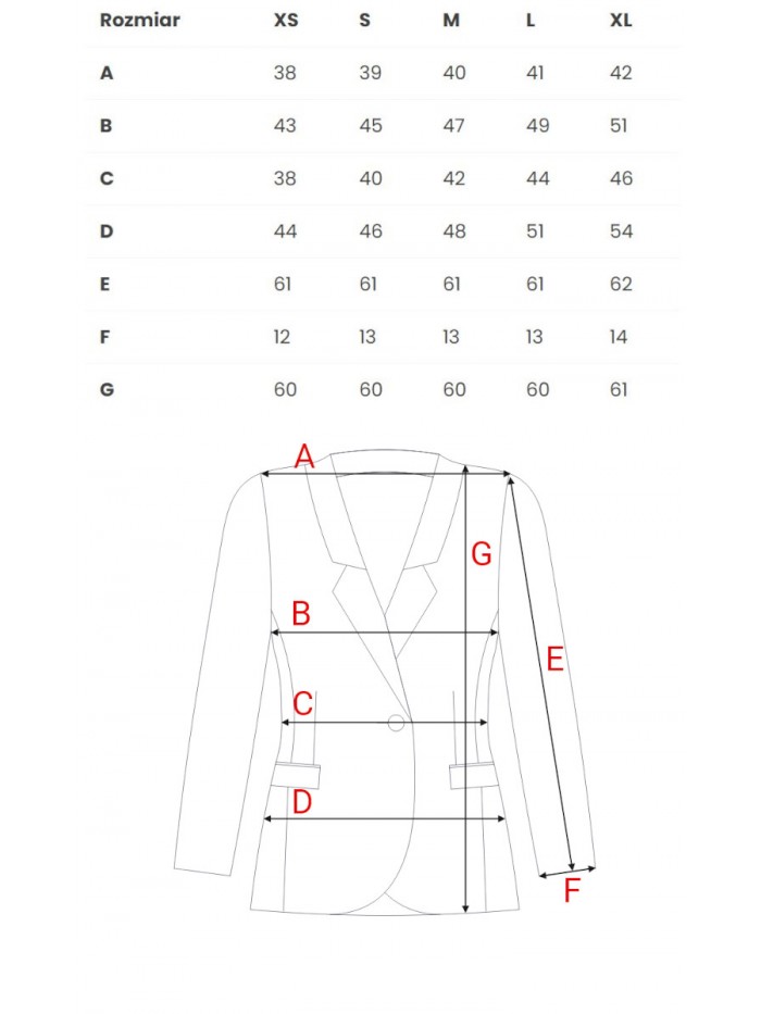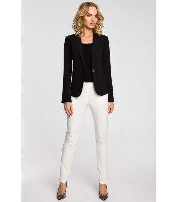 Klasyczny, elegancki, gładki, taliowany, ‘biurowy’ żakiet na podszewce, zapinany na jeden guzik. Klasyczne klapy, długie rękawy z rozcięciem na dole i ozdobione złotym guzikiem. Z tyłu rozcięcie.