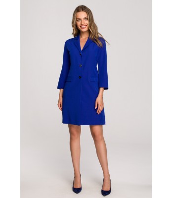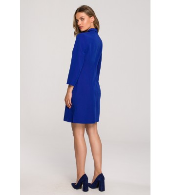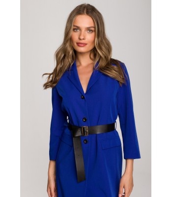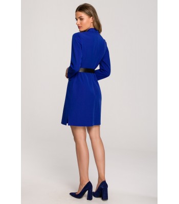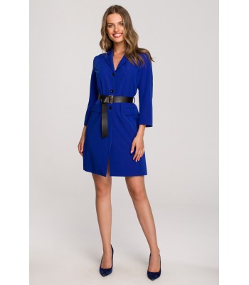 Elegancka i profesjonalna. Taka jest nasza sukienka żakietowa z kołnierzem i guzikami oraz paskiem z ozdobną klamrą.