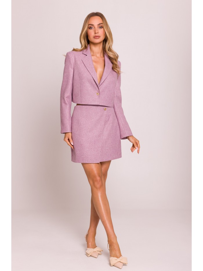 Klasyczny, elegancki, gładki, taliowany, ‘biurowy’ żakiet na podszewce, zapinany na jeden guzik. Klasyczne klapy, długie rękawy z rozcięciem na dole i ozdobione złotym guzikiem. Z tyłu rozcięcie.