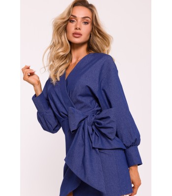 Sukienka swetrowa z wiązaniem na boku, którą chce się założyć i wyglądać pięknie, a przy tym czuć się komfortowo. Posiada szerokie rękawy zakończone mankietami oraz głęboki dekolt na zakładkę. Długość mini sprawi, że poczujesz się kobieco.