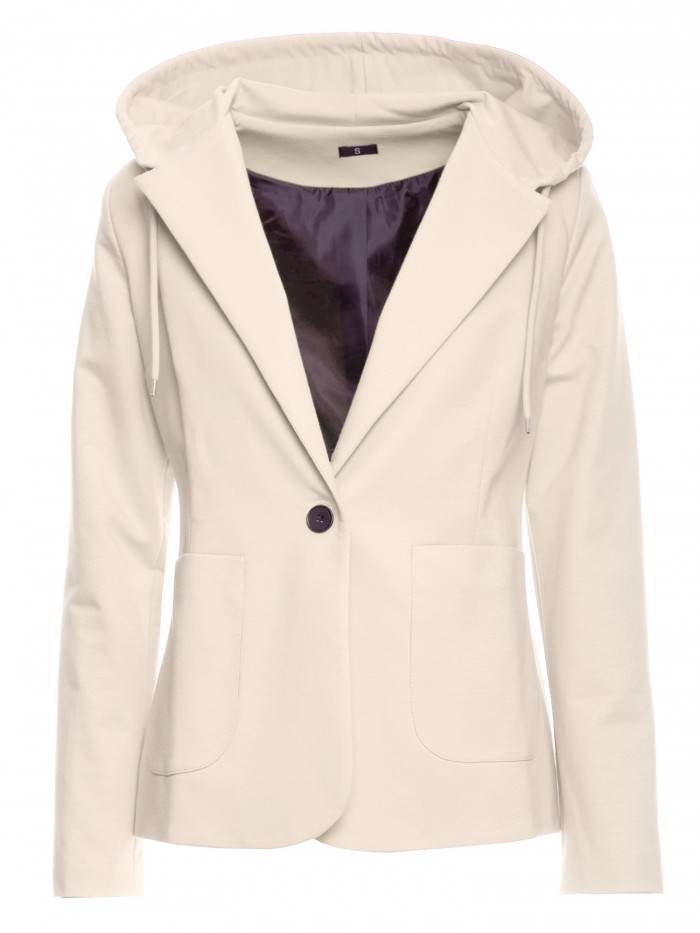 Jeśli myślałaś, że żakiet znasz już w każdej wersji to my mamy coś zupełnie nietuzinkowego. Żakiet, ale uszyty z dzianiny, na podszewce i zapinany na jeden guzik. Jednak zamiast klasycznego kołnierza zaprojektowaliśmy kołnierz przechodzący w kaptur z trokami, a na przodzie naszyliśmy dwie wygodne kieszenie.